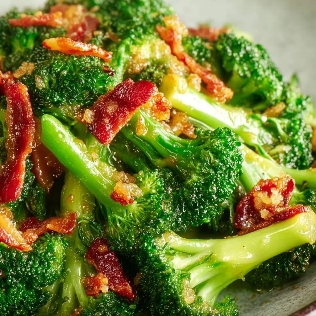 A quick and easy dish featuring stir-fried broccoli in a savory garlic sauce topped with crispy bacon.