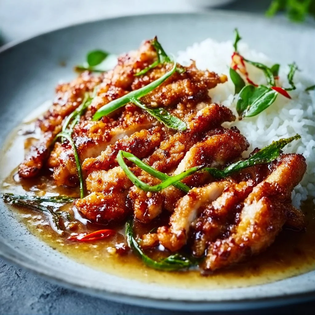- Serve the caramelised chicken over rice and top with sliced green onions and a pinch of pepper.