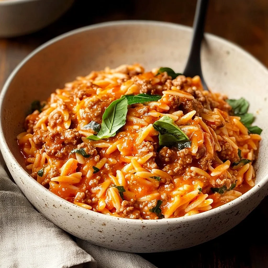 A comforting and simple dinner option that combines orzo pasta with ground beef and a rich creamy tomato sauce.