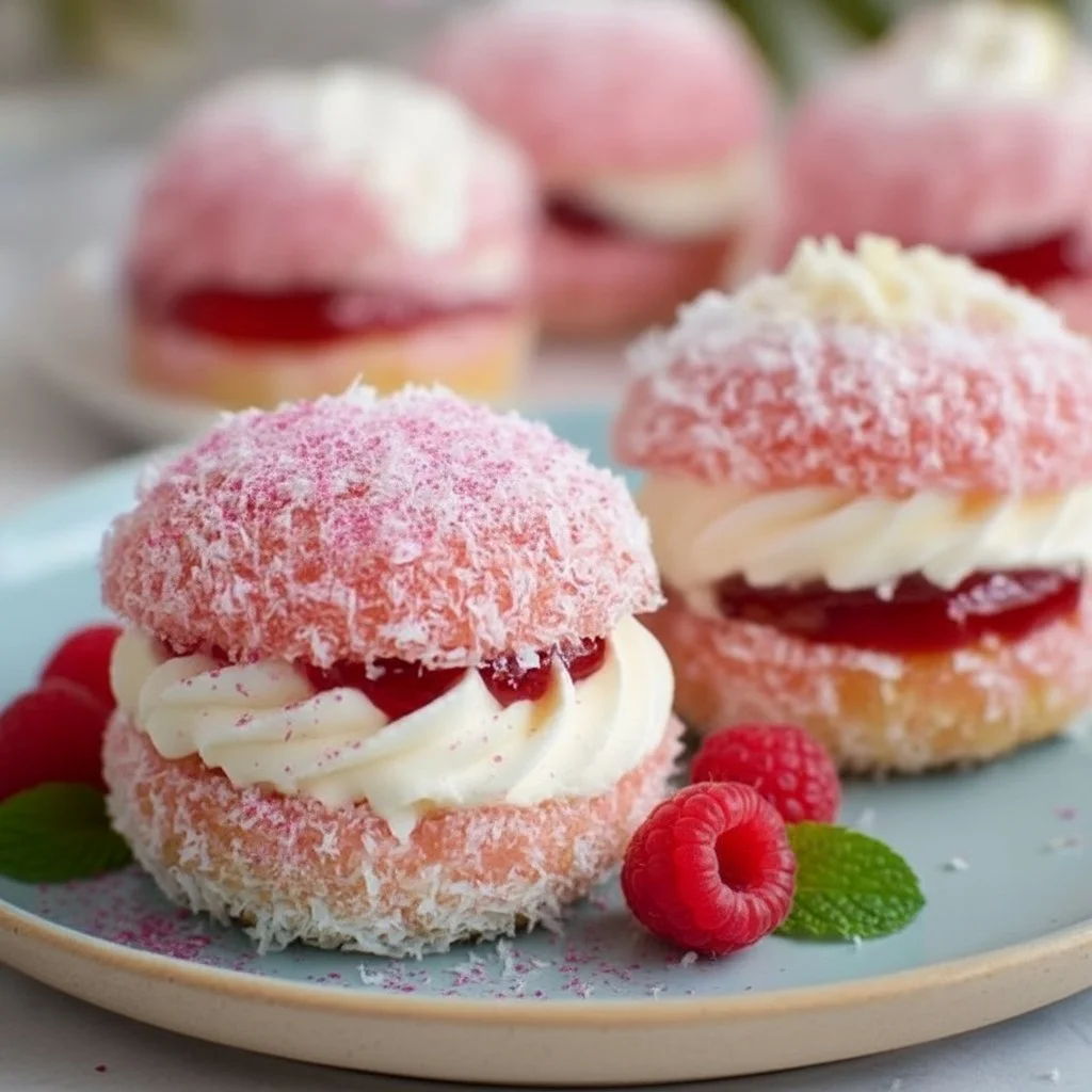 Delightful Fluffy Vanilla Sponge Cakes filled with sweet strawberry jelly and topped with whipped cream, perfect for special occasions.