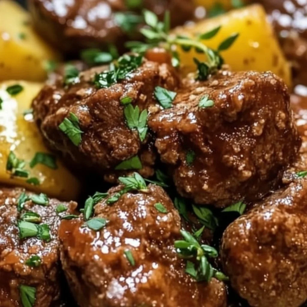 A warm, hearty dish of tender beef and baby potatoes, slow-cooked in garlic butter for an inviting aroma and delicious flavor.